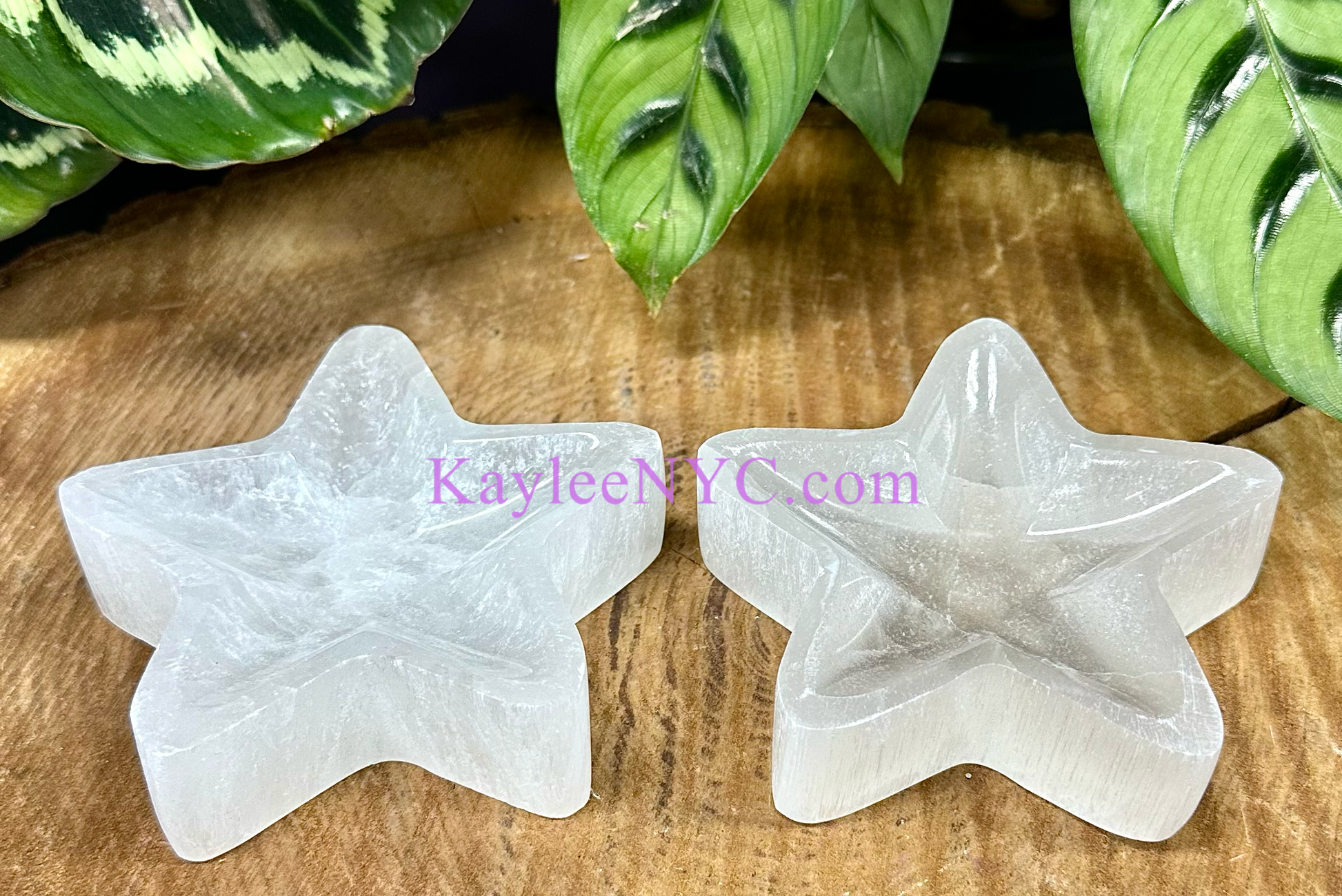 Natural Selenite aka Satin Spar Star Bowls. These bowls can range from 9.5cm to 10cm wide, about 3cm tall. Satin Spar is found and made in Morocco.