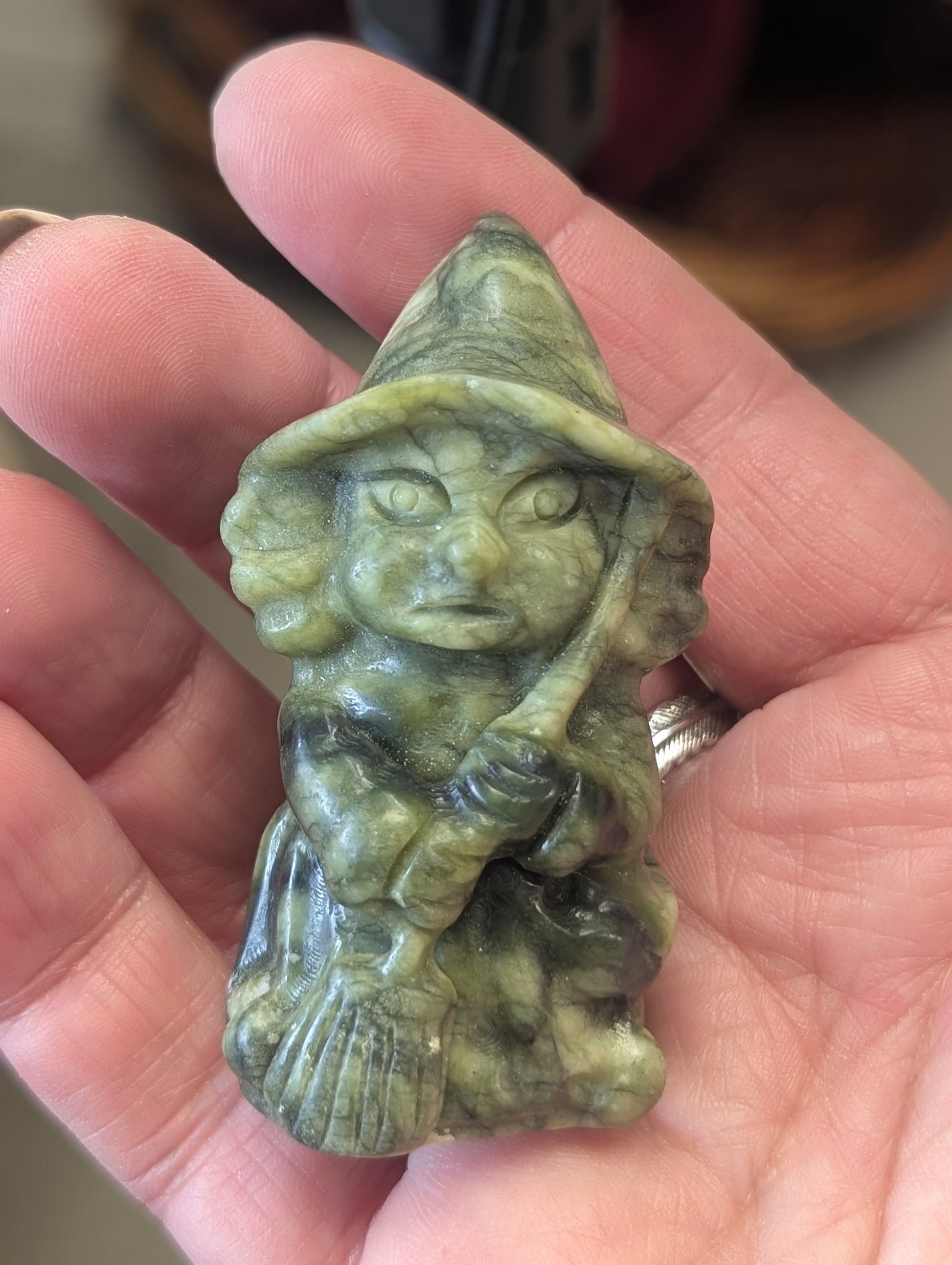 Sarah absolutely loves these little witches. Each one is carved from genuine Nephrite Jade and stands about 6 cm tall (roughly 2.36 inches). She keeps one on her own altar for protection and heart healing—it’s become a quiet guardian in her space, and she believes you’ll feel their magic too.
