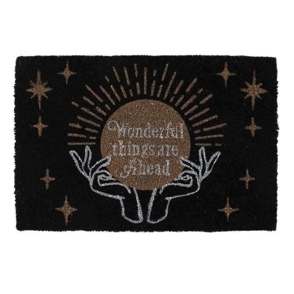 This enchanting black coir doormat is part of our popular Fortune Teller range of gothic giftware. The doormat features a golden crystal ball with the text 'Wonderful things are ahead' emerging from inside. This would be a great item for a fun welcome at the front door of any witch's home. Due to the high concentration of dye used to obtain this colour do not place onto pale surfaces (especially leather) as this may result in dye transfer. Design may fade in extreme weather. Suggested for sheltered and indoor use only. Designed by the creative design team at Something Different Wholesale.