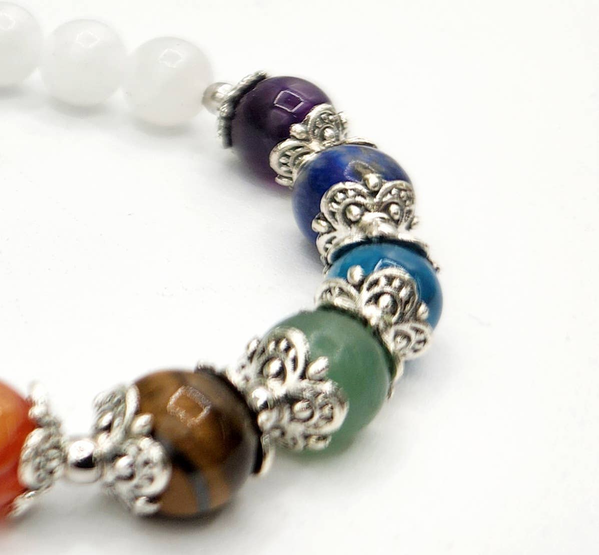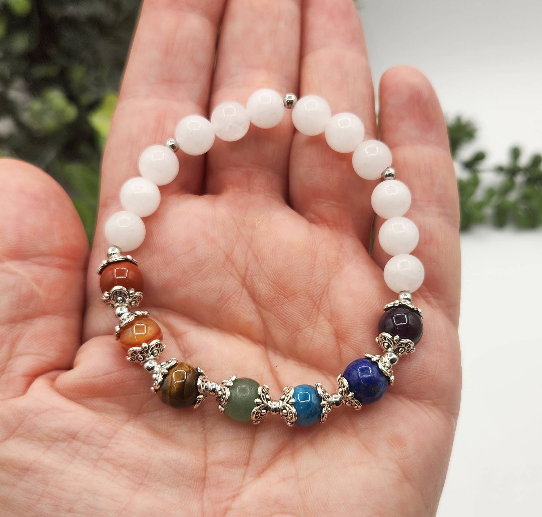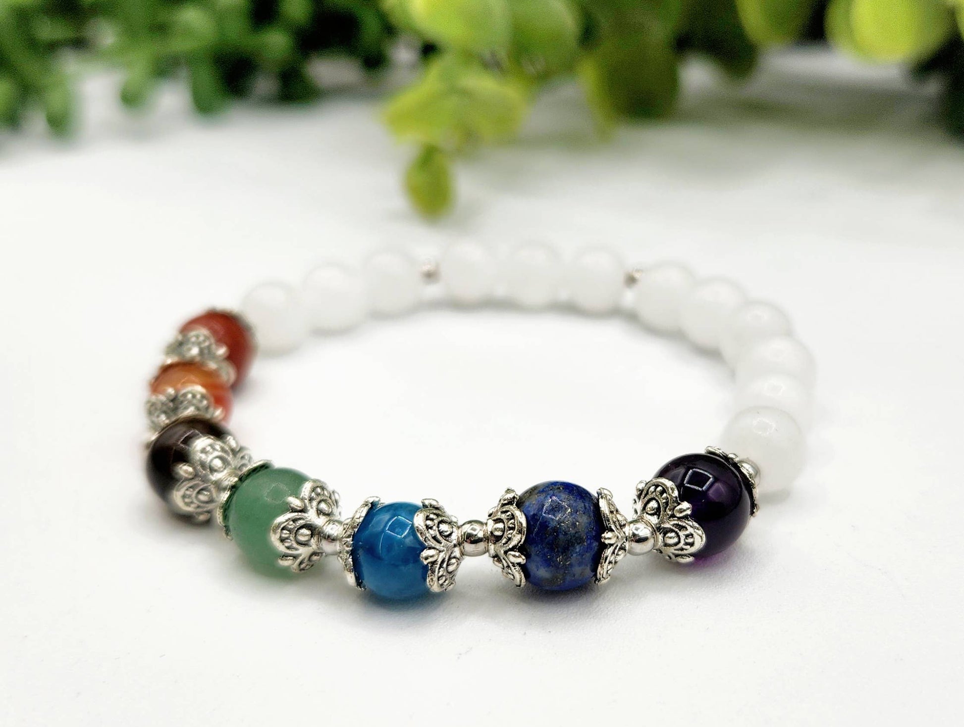 This beautiful stretch bracelet pairs the pure energy of White Jade with the vibrant power of the seven chakra stones, creating a wearable reminder of alignment and renewal. The luminous white of the Jade beads makes each colorful gemstone pop, while silver-toned accents add a touch of elegance.