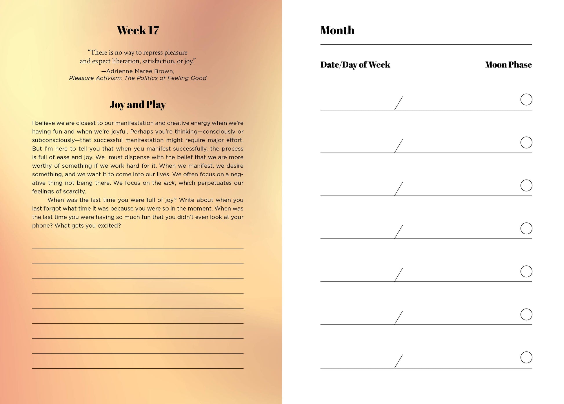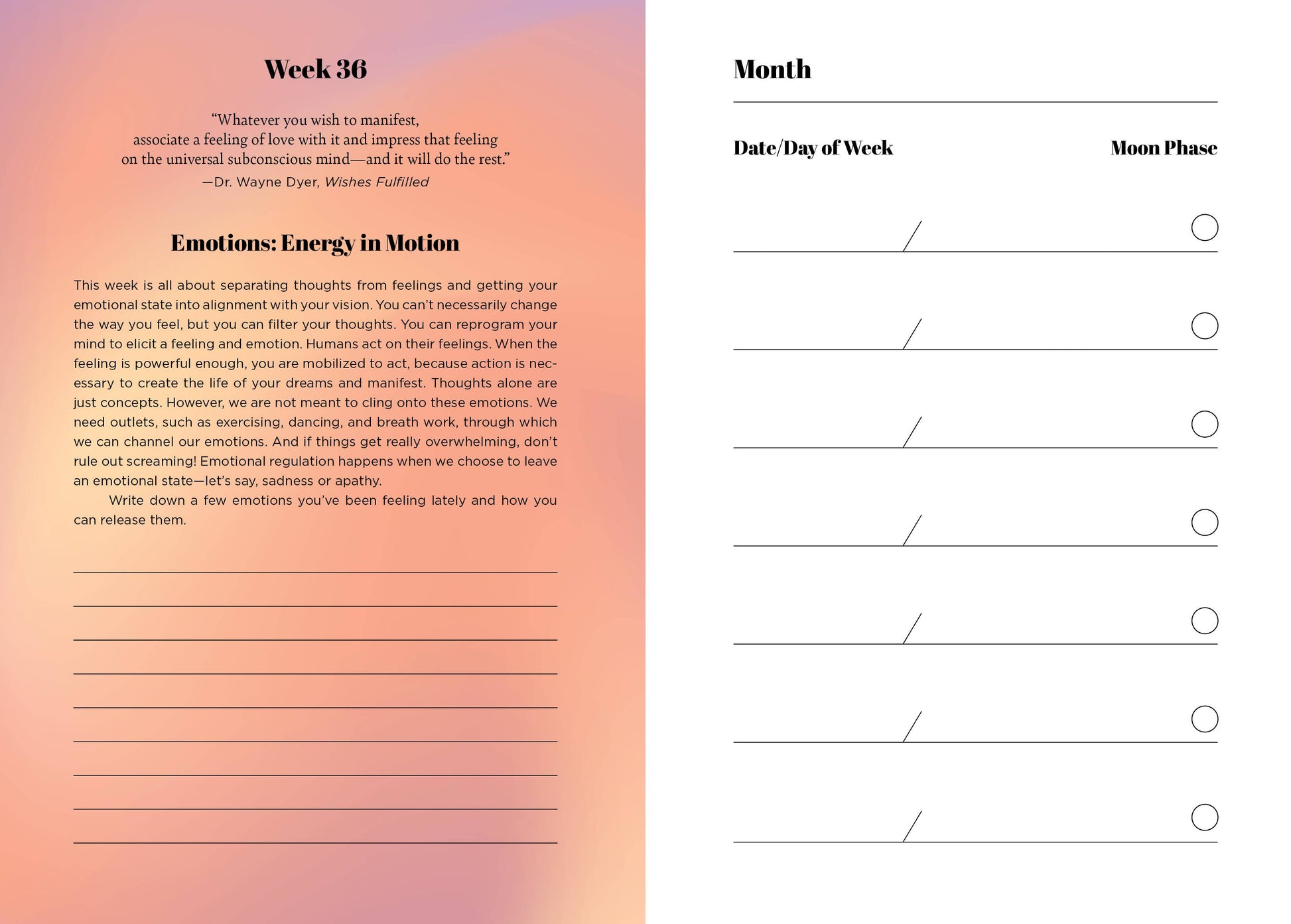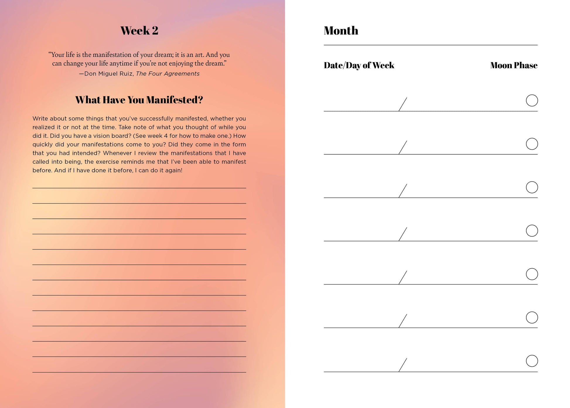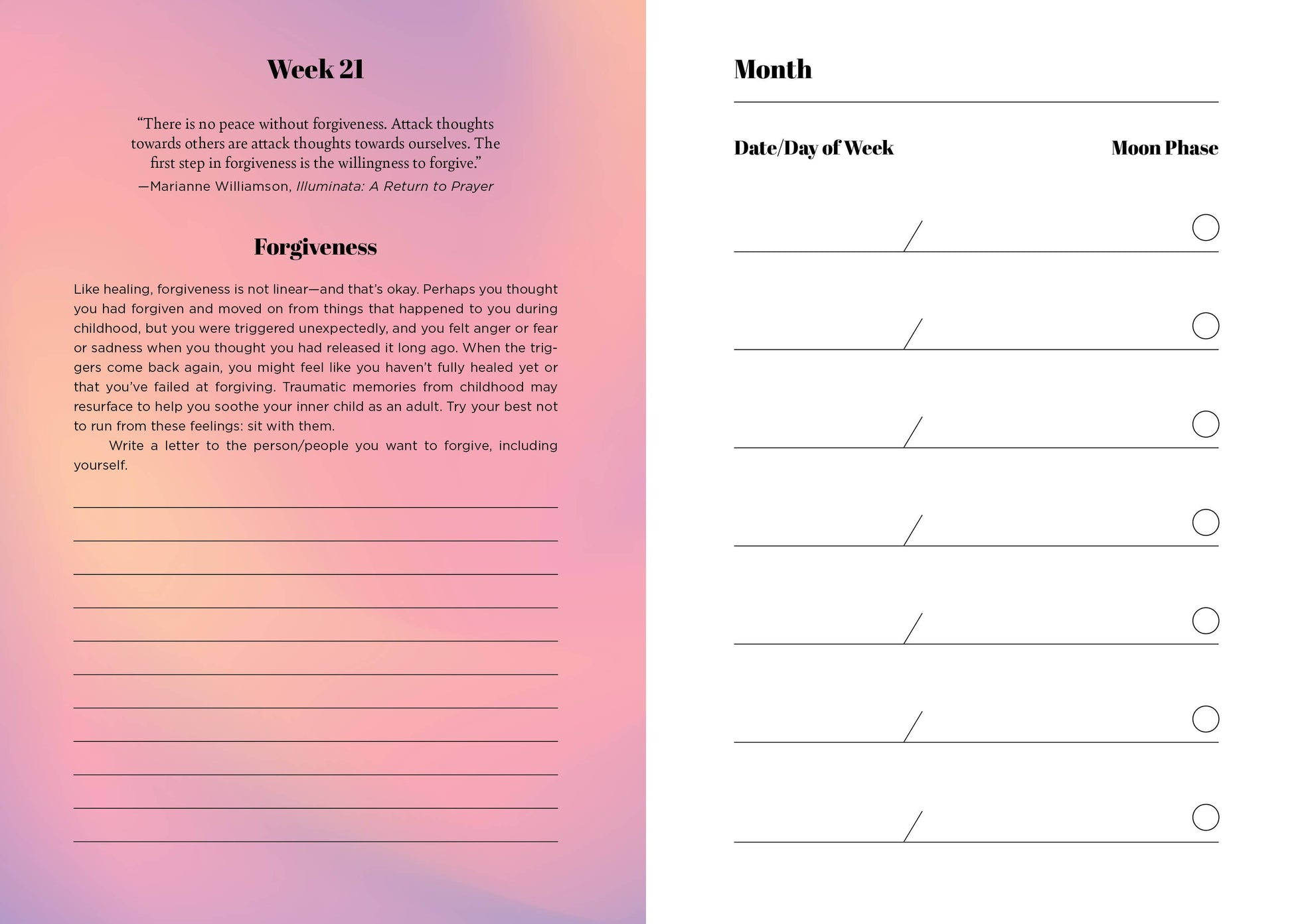 - Weekly Prompts: Thoughtful prompts to inspire reflection and focused intention.
